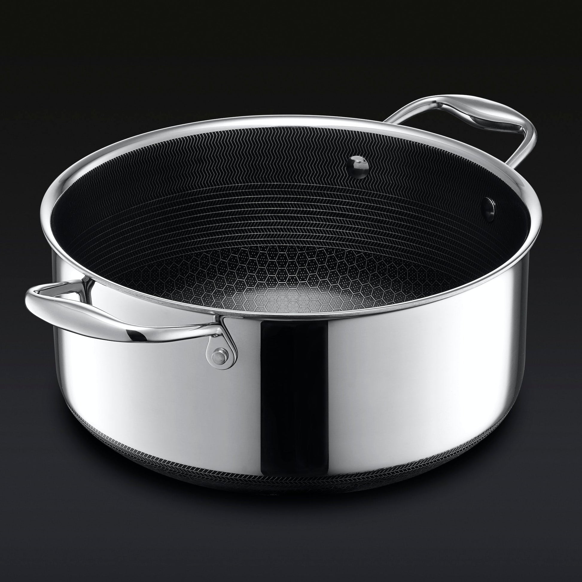 Meet the new center of attention. The HexClad Dutch Oven takes top-of-the-line cooking performance and adds (and subtracts) where it counts. This 5-quart showstopper is half the weight of traditional Dutch Ovens, giving you maximum maneuverability to go along with HexClad durability. Patented Hybrid technology quickly and evenly distributes heat for perfect casseroles, roasts, breads, and braises ¡ª and makes it cinch to clean (by hand or in the dishwasher). The mirror-finished stainless-steel lid seals in moisture and flavor for superior stews, sauces, and simmers. There aren¡¯t many pots in your kitchen that can do this many things ¡ª and look this good doing it.