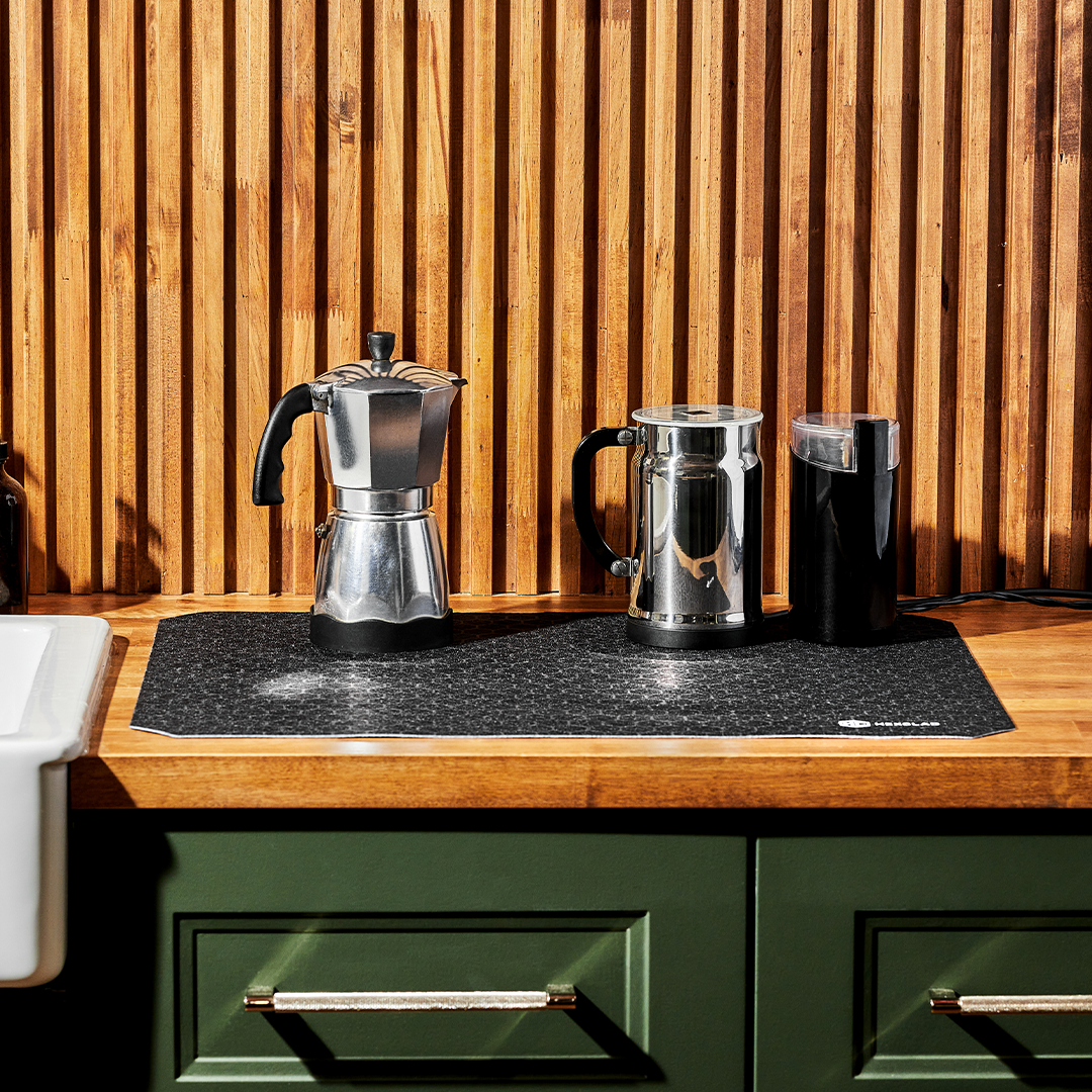 From the clutter in the corners to the dishes situation, it¡¯s challenging to keep a kitchen clean and dry. A rumpled towel to air-dry dishes isn¡¯t gonna cut it any more, because this isn¡¯t college. Meet the new HexClad Dish Drying Mat. Made from an absorbent, quick-drying material that can hold up to a cup of water, it¡¯s just the thing to throw under a dish-drying rack, spread out on the counter for extra silverware, or use as a protective layer under small appliances. Its waterproof backing keeps moisture from seeping through, you can trim the extra-large surface to fit your counter¨Cit won¡¯t fray¨Cand it¡¯s machine-washable. A stable, slip-resistant backing and a low-profile surface help keep stemware stable. Bonus: It¡¯s good-looking, and made in the USA.