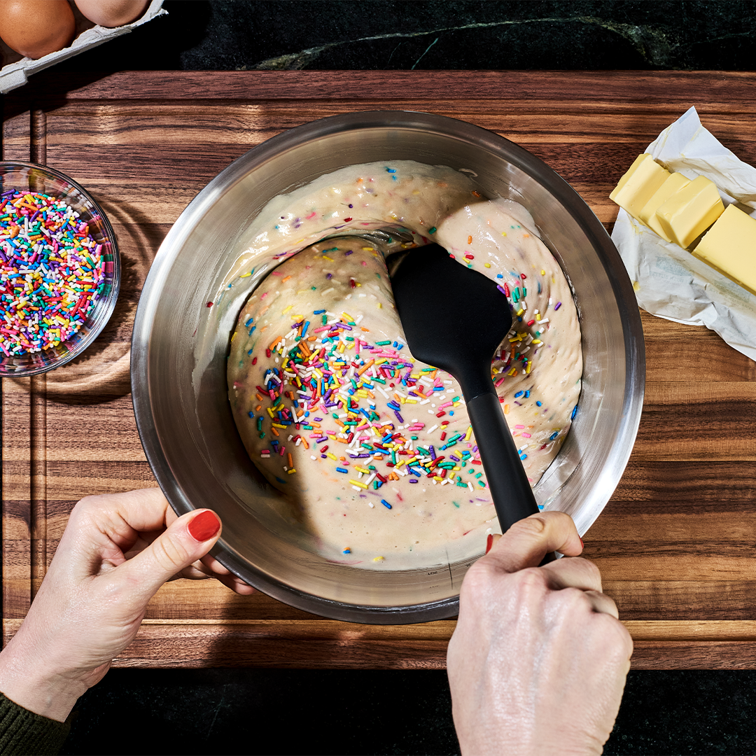 - Spatula: Flexible silicone blade is nimble enough to fold whipped egg whites, scrape bowls, scramble eggs and turn omelets or crepes.